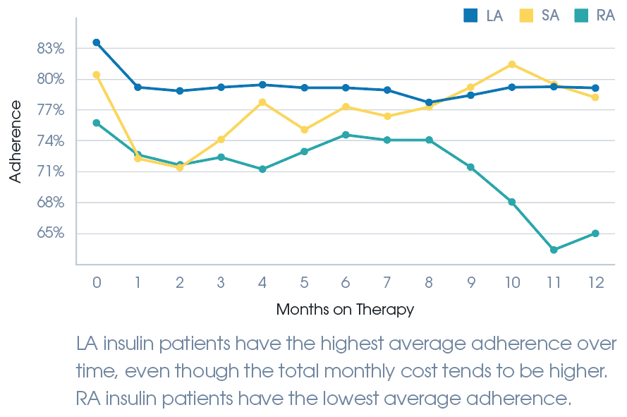 Medisafe analyzed whether cost impacts adherence rates among patients, comparing the management of long-acting (LA), short-acting (SA), and rapid- acting (RA) insulin types on our platform.