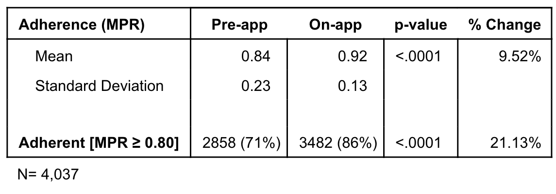 - The proportion of patients with MPR ≥ 0.80 increased from 70.80% pre-app to 86.25% on-app, a 21.8% relative increase.