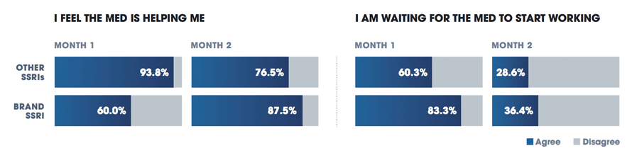 Medisafe surveyed almost 2,000 patients and discovered that it takes Brand-SSRI patients six to eight weeks to experience therapeutic benefits from their medication compared to other SSRI patients who report benefits in as few as four to six weeks.