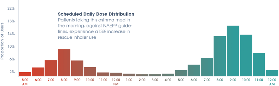 Medisafe data shows that more than 25% of patients who take a leading asthma medication do so in the morning. Guidelines from the National Asthma Education and Prevention Program (NAEPP) state that this medication should only be taken at night for maximum efficacy.