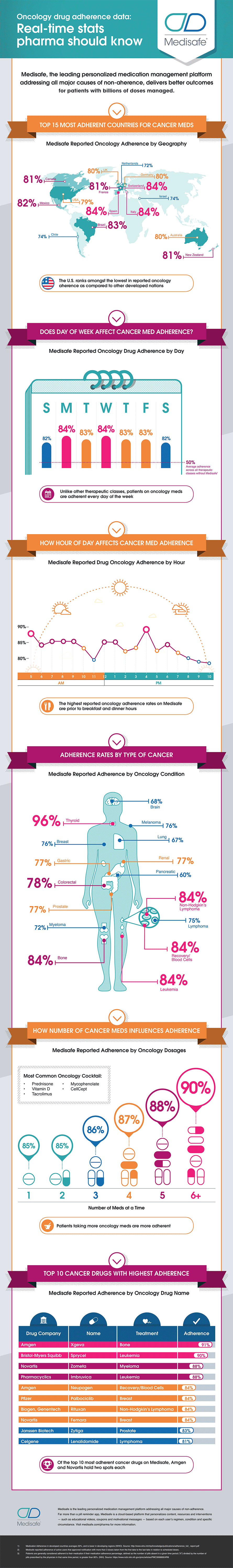- Of the top 10 most adherent cancer drugs on Medisafe, Amgen and Novartis hold two spots each
